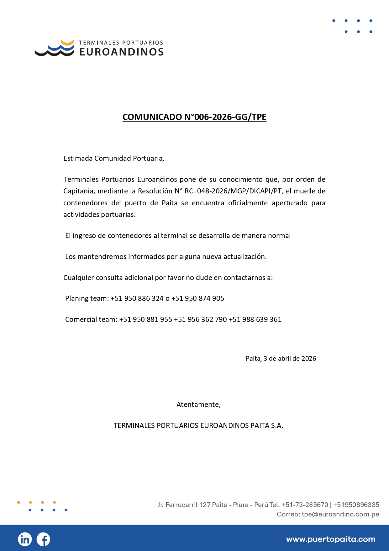 Jr. Ferrocarril 127 – Paita - Piura - Perú