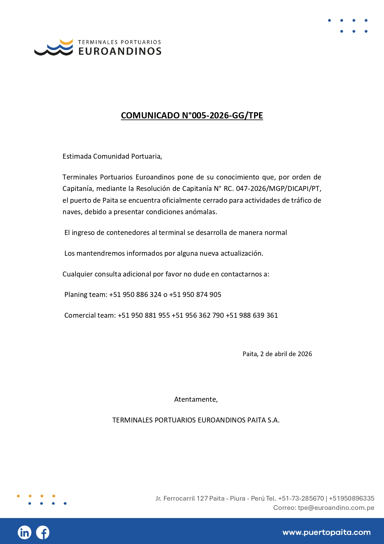 COMUNICADO 006-2026-GG-TPE-Apertura de muelle de contenedores